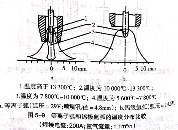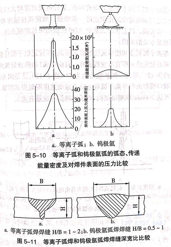 因此(ci),等離子弧焊(han)的焊(han)縫截(jie)面形狀較窄(zhai),深(shen)寬比(bi)大,無(wu)疑焊(han)件變形就小(xiao)。等離子弧焊(han)和鎢極氬(ya)弧焊(han)深(shen)寬比(bi)比(bi)較見圖5-11。