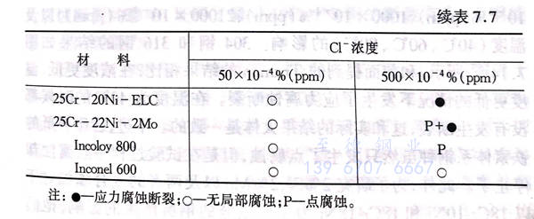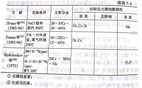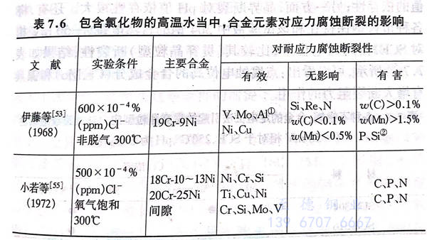 小(xiao)若(ruo)等(1972年)使用(yong)氧飽和狀態的(de)(de)(de)包含500x10-4%(ppm)氯離子在(zai)內的(de)(de)(de)高(gao)溫(wen)水(shui),研究C、Si、Mn、P、S、Cu、Mo、Ti還有(you)氮對于18Cr-10~13Ni鋼(gang)以及20Cr-25Ni鋼(gang)的(de)(de)(de)應力(li)腐(fu)蝕斷裂(lie)(lie)的(de)(de)(de)影響(xiang),結果(guo)表明:針對18Cr-10~13Ni鋼(gang)(single U-bend),C、P、N能(neng)(neng)(neng)夠(gou)顯著地提(ti)高(gao)其裂(lie)(lie)紋(wen)敏(min)感性(xing),Ni、Cr、Si、Ti和Cu能(neng)(neng)(neng)夠(gou)在(zai)一(yi)(yi)定(ding)程度上(shang)降低其敏(min)感性(xing);另一(yi)(yi)方面,對于20Cr-25Ni鋼(gang)(double U-bend)來說,C、P、N仍然(ran)能(neng)(neng)(neng)夠(gou)提(ti)高(gao)其裂(lie)(lie)紋(wen)敏(min)感性(xing),Ni、Cr、Si、Mo、V能(neng)(neng)(neng)夠(gou)在(zai)一(yi)(yi)定(ding)程度上(shang)降低其敏(min)感性(xing)。根據這(zhe)些研究結果(guo)開發(fa)出了0.02C-2Si-25Cr-25Ni-2.7 V鋼(gang),并通(tong)過使用(yong)氯離子500x10-4%(ppm)、300℃、非脫氣的(de)(de)(de)高(gao)溫(wen)水(shui)進行1000h的(de)(de)(de)試(shi)驗(yan),確認沒有(you)斷裂(lie)(lie)發(fa)生。將上(shang)述伊藤等、小(xiao)若(ruo)等有(you)關合金(jin)元素影響(xiang)的(de)(de)(de)試(shi)驗(yan)結果(guo)同日本國外(wai)的(de)(de)(de)實驗(yan)結果(guo)相比較,總結出表7.6.根據表7.6可以看出:在(zai)高(gao)溫(wen)水(shui)中,除了鎳以外(wai)鉻也能(neng)(neng)(neng)夠(gou)有(you)效地增大斷裂(lie)(lie)阻力(li),這(zhe)一(yi)(yi)點(dian)日本國內外(wai)的(de)(de)(de)意見是一(yi)(yi)致的(de)(de)(de);另外(wai)銅對于增大斷裂(lie)(lie)阻力(li)也是很有(you)效的(de)(de)(de)。