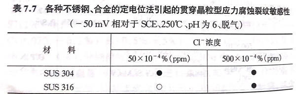 還有,高張等(1972年(nian))采(cai)用經過敏化處理的(de)(de)5種(zhong)碳含(han)量不(bu)(bu)同的(de)(de)市(shi)售鋼(gang)(gang)(304、304 L、304ELC、321、321L),在氯離子(10~100)x10-4%(ppm)、溫(wen)度300℃的(de)(de)非脫氣高溫(wen)水(shui)(shui)中(zhong)施加應(ying)(ying)力(li)進(jin)行試驗,結(jie)果發現碳含(han)量增多時(晶(jing)界)裂(lie)(lie)(lie)紋(wen)敏感性(xing)(xing)會提高。泊里(li)等(1980年(nian))也以(yi)304不(bu)(bu)銹鋼(gang)(gang)和316不(bu)(bu)銹鋼(gang)(gang)為對(dui)象研究它們在高溫(wen)水(shui)(shui)(250℃、氯離子500x10-4%(ppm))中(zhong)發生應(ying)(ying)力(li)腐蝕斷(duan)(duan)裂(lie)(lie)(lie)的(de)(de)電位(wei)(wei)-pH圖(tu),結(jie)果認為:穿晶(jing)裂(lie)(lie)(lie)紋(wen)對(dui)電位(wei)(wei)的(de)(de)依(yi)(yi)存性(xing)(xing)大于對(dui)pH值的(de)(de)依(yi)(yi)存性(xing)(xing);另(ling)一方面,晶(jing)界斷(duan)(duan)裂(lie)(lie)(lie)對(dui)pH值依(yi)(yi)存性(xing)(xing)很(hen)大。還有,將各種(zhong)市(shi)售鋼(gang)(gang)保持在和該試驗液中(zhong)304不(bu)(bu)銹鋼(gang)(gang)的(de)(de)自然電位(wei)(wei)(-50mV相對(dui)SCE)相同的(de)(de)電位(wei)(wei)上,比較其(貫穿晶(jing)粒型)斷(duan)(duan)裂(lie)(lie)(lie)性(xing)(xing),結(jie)果如表7.7所示(shi),可以(yi)看(kan)出:點腐蝕電位(wei)(wei)高的(de)(de)合金成分(fen)(Cr、Mo)和鎳(nie)具有增大斷(duan)(duan)裂(lie)(lie)(lie)阻力(li)的(de)(de)作用。
