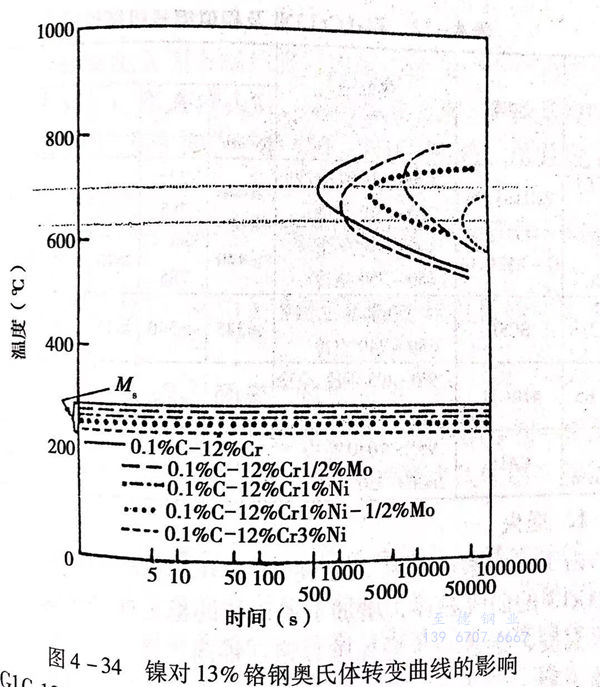 前已述及Cr13鋼鑄件,尤其是形狀復雜的鑄件,如葉輪、導翼等,會由于組織中含有較多的δ鐵素體,不僅影響機械性能,降低韌性,而且,自高溫冷卻過程中產生的脆化會導致產生裂紋(有時稱鐵索體裂紋)。因此,δ鐵素體的存在成為Cr13鑄鋼的特殊問題。如果δ鐵素體呈細粒狀、彌散分布時情況稍好些,而以較大塊狀存在或沿品界析出時,則會造成重大危害,且,δ鐵素體一旦形成,由于鉻的擴散速度慢,在熱處理加熱保溫過程中也不易消除。為減少Cr13型不銹鑄鋼中的8鐵素體,雖然用碳、氮、錳、鈷元素可以改善,但有的作用不明顯,有的會有其他的不利作用。因此,以加入0.5%~1.5%鎳元素來詞整組織成為有效的方法。鎳是擴大γ相區的元素,具有穩定組織的作用,鎳的加入還改變了相變點,見圖4-33,并使奧氏轉變曲線右移,見圖4-34。