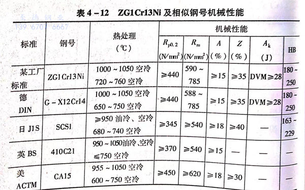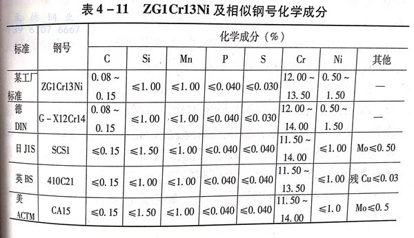 ZG1Cr13Ni及國外一些相似材(cai)料(liao)的成(cheng)分和(he)性能(neng)標(biao)準參見表 4-11 和(he) 表 4-12。