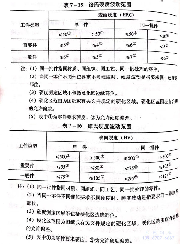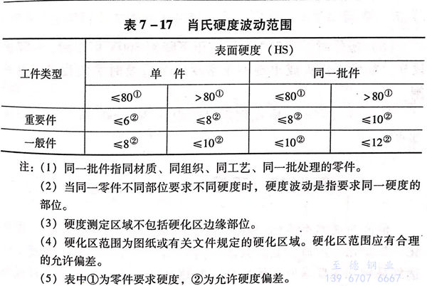 淬火表面應達(da)到技術(shu)要求(qiu)的(de)硬(ying)(ying)(ying)度(du),硬(ying)(ying)(ying)度(du)檢驗可(ke)根據(ju)零(ling)件大小(xiao)和硬(ying)(ying)(ying)化層的(de)深度(du),采用洛氏(shi)法(fa)(GB/T 230)、維(wei)氏(shi)法(fa)(GB/T4340)或肖氏(shi)法(fa).(GB/T 4341).大型(xing)工件也可(ke)以用銼刀檢測。表面硬(ying)(ying)(ying)度(du)允許波(bo)動范(fan)圍見表7-15~表7-17。