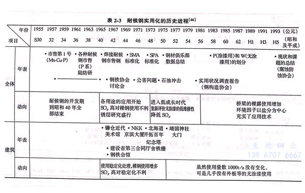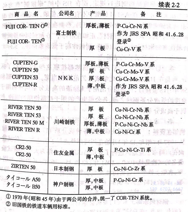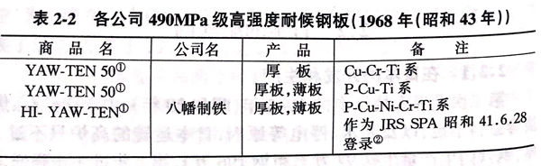 詳情請參(can)照卷末的(de)(de)(de)(de)資(zi)料1,最初銷(xiao)售的(de)(de)(de)(de)鋼(gang)(gang)種在1957年(nian)(nian)(nian)(nian)(昭(zhao)和32年(nian)(nian)(nian)(nian))是銅系(xi)的(de)(de)(de)(de)Cuplon鋼(gang)(gang),1960年(nian)(nian)(nian)(nian)(昭(zhao)和35年(nian)(nian)(nian)(nian))是YAW-TEN鋼(gang)(gang)(Cu-P-Ti系(xi))、FUJI COR-TEN鋼(gang)(gang),1961年(nian)(nian)(nian)(nian)開始(shi)生產銷(xiao)售Cupten鋼(gang)(gang)(Cu-P-Cr系(xi))。以后(hou),其他(ta)廠家(jia)的(de)(de)(de)(de)商品也開始(shi)銷(xiao)售,通(tong)過車輛及(ji)一般結構(gou)用(高磷)和焊接結構(gou)用(低磷)的(de)(de)(de)(de)劃(hua)(hua)(hua)分,按(an)用途不(bu)同(tong)的(de)(de)(de)(de)品種劃(hua)(hua)(hua)分,以及(ji)焊接結構(gou)用按(an)抗拉強(qiang)度(du)不(bu)同(tong)的(de)(de)(de)(de)品種劃(hua)(hua)(hua)分等(deng),實現(xian)了多品種化。到20世紀60~70年(nian)(nian)(nian)(nian)代(昭(zhao)和40年(nian)(nian)(nian)(nian)代初期),大致的(de)(de)(de)(de)品種已經齊全(quan),1968年(nian)(nian)(nian)(nian)(昭(zhao)和43年(nian)(nian)(nian)(nian))時的(de)(de)(de)(de)490MPa(50kg/m㎡)級(ji)的(de)(de)(de)(de)高強(qiang)度(du)耐候鋼(gang)(gang)的(de)(de)(de)(de)典型產品示于表2-2。