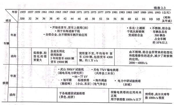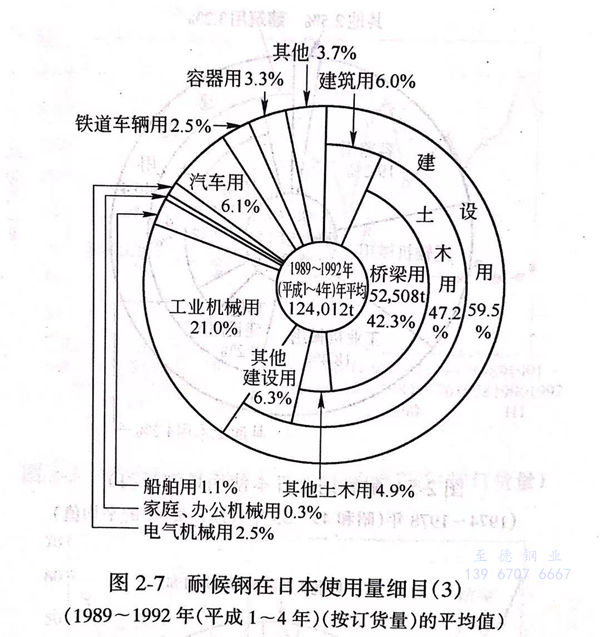 下一節(jie)以(yi)后將按(an)用途使(shi)用的(de)動向敘述。在(zai)表2-3中(zhong),以年表示出(chu)了耐(nai)候鋼40年間的(de)(de)動向。并且(qie)在(zai)圖2-3及圖2-4上(shang)示出(chu)了日(ri)本鋼材使用(yong)量的(de)(de)變化。圖2-5~圖2-7是以圓形(xing)圖表示的(de)(de)1974~1978年(昭(zhao)(zhao)和49~昭(zhao)(zhao)和53年)、1985年(昭(zhao)(zhao)和60年)以及1989~1992年(平成元年~平成4年)的(de)(de)用(yong)途比率(lv)。