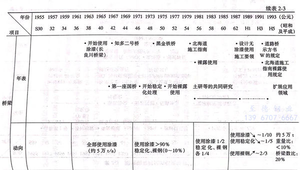 每座(zuo)橋梁(liang)的(de)使(shi)(shi)用(yong)鋼(gang)材量比較大,經常保持在按(an)用(yong)途使(shi)(shi)用(yong)量的(de)首位。20世紀(ji)70~80年代(昭和50年代)后期幾(ji)乎都是涂漆使(shi)(shi)用(yong)。然(ran)而以后由于補修涂漆、再涂漆在橋梁(liang)整體上出現(xian)了費用(yong)問題,并且(qie)隨著技(ji)術的(de)進步、腐(fu)蝕環(huan)境的(de)改(gai)善等,逐漸地使(shi)(shi)無涂漆使(shi)(shi)用(yong)成為(wei)了中心。