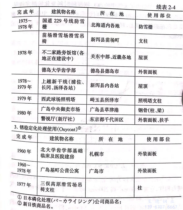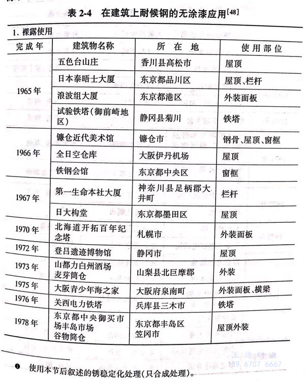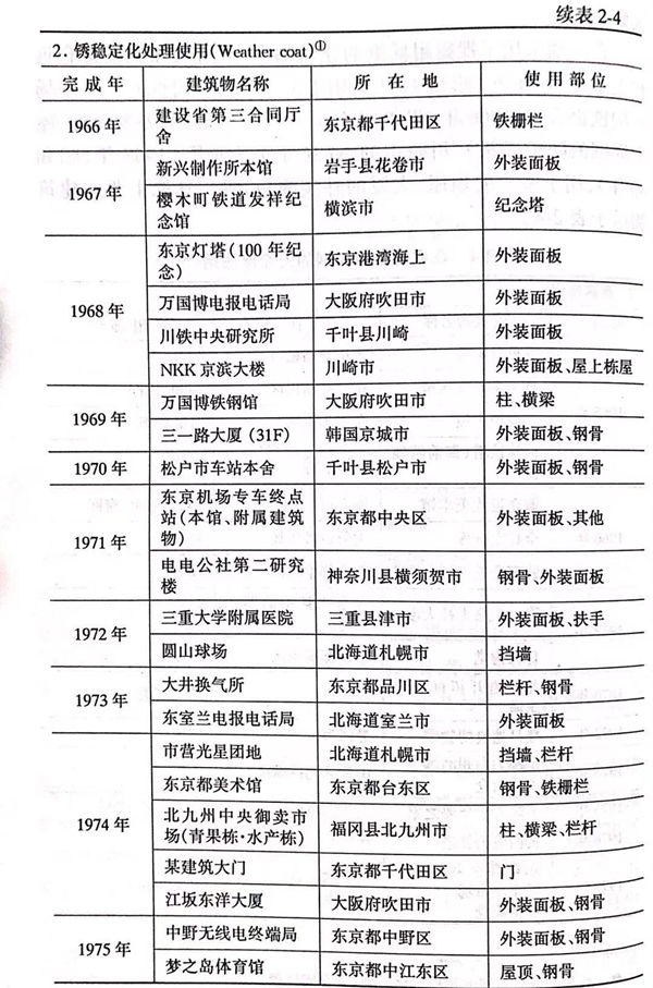 在初期采用了裸露耐(nai)候鋼的(de)(de)建筑物中,人所共(gong)知(zhi)的(de)(de)是鐮倉近(jin)代美(mei)術(shu)館(1966年(昭(zhao)和(he)41年),用于(yu)(yu)鋼骨(gu)、屋頂、窗框(kuang))、東京茅場(chang)町的(de)(de)鐵鋼會館(1966年(昭(zhao)和(he)41年),用于(yu)(yu)欄(lan)桿(gan)、部分(fen)外裝面(mian)板、屋上(shang)周圍的(de)(de)防護面(mian)板)、川(chuan)崎市的(de)(de)NKK京濱大(da)廈(1968年(昭(zhao)和(he)43年),用于(yu)(yu)屋上(shang)的(de)(de)頂屋、大(da)廈的(de)(de)外裝面(mian)板)等。其他主(zhu)要的(de)(de)建筑物示于(yu)(yu)表2-4。