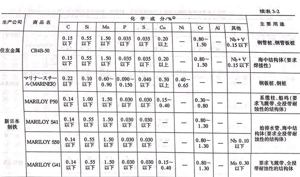 這些鋼(gang)(gang)(gang)種的(de)(de)(de)(de)開發,到1970年代初(chu)期(昭和46~47年)基本(ben)結(jie)束,各公(gong)司(si)開始生產銷售。表(biao)3-2示出了日本(ben)現在正(zheng)在生產的(de)(de)(de)(de)耐(nai)海水鋼(gang)(gang)(gang)。1973年出版的(de)(de)(de)(de)鋼(gang)(gang)(gang)材俱樂部的(de)(de)(de)(de)“關(guan)于鋼(gang)(gang)(gang)材的(de)(de)(de)(de)腐(fu)蝕防蝕的(de)(de)(de)(de)資料(liao)”中,用表(biao)給出的(de)(de)(de)(de)“日本(ben)國內各鋼(gang)(gang)(gang)鐵(tie)公(gong)司(si)的(de)(de)(de)(de)耐(nai)海水鋼(gang)(gang)(gang)的(de)(de)(de)(de)規(gui)格”常常被引(yin)用,表(biao)3-2是以此(ci)為基礎參考文獻追加了以后的(de)(de)(de)(de)鋼(gang)(gang)(gang)種制成的(de)(de)(de)(de)。與耐(nai)候鋼(gang)(gang)(gang)不(bu)同成分系相當(dang)多,還沒有(you)成為JIS標準。