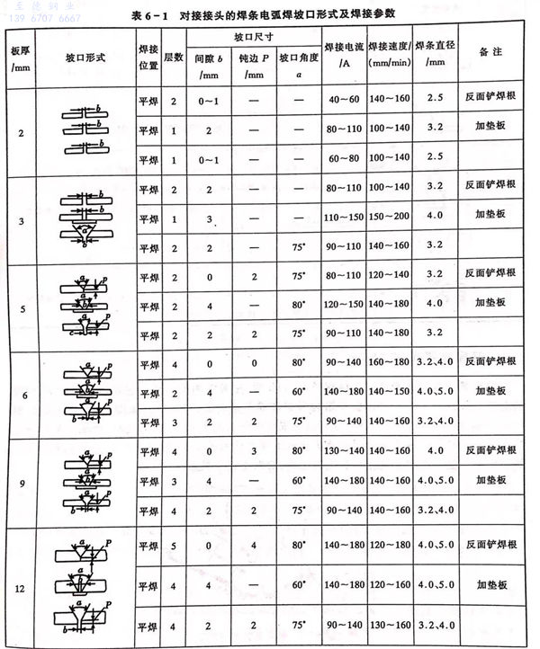 不銹(xiu)鋼焊(han)接(jie)的(de)坡(po)口(kou)(kou)選擇很關鍵。坡(po)口(kou)(kou)形(xing)式的(de)選擇原則是保(bao)證焊(han)接(jie)接(jie)頭(tou)質量,保(bao)證焊(han)透(tou)和盡(jin)量避免產生焊(han)接(jie)缺陷和焊(han)接(jie)變(bian)形(xing),盡(jin)可能減少焊(han)接(jie)材料的(de)消耗量,同時(shi)必(bi)須確(que)保(bao)工藝的(de)可操(cao)作(zuo)性。在板厚小于3mm時(shi)不用開坡(po)口(kou)(kou);當板厚大于3mm時(shi)可選用V形(xing)坡(po)口(kou)(kou);厚度更(geng)大(20mm以上)時(shi)可用X形(xing)坡(po)口(kou)(kou)或U形(xing)坡(po)口(kou)(kou)。表6-1是常見焊(han)條電弧焊(han)坡(po)口(kou)(kou)形(xing)式。