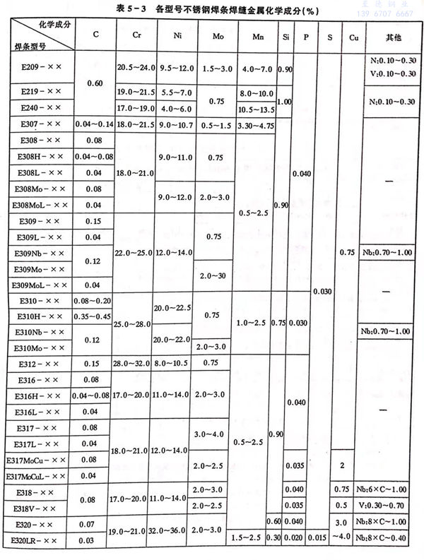 國家標準GB/T 983-1995中規定(ding)了不(bu)銹(xiu)鋼焊條的(de)型號(hao)分類、技術要求(qiu)、試驗方(fang)法及檢(jian)驗規則等(deng)。該標準規定(ding),所(suo)適用的(de)不(bu)銹(xiu)鋼焊條熔敷金屬中鉻含量應大于10.50%,鐵的(de)含量應超過其(qi)他任何元素(見表(biao)5-1,表(biao)5-2).