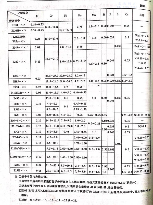 GB/T 983 -1995 根(gen)據熔敷金(jin)屬的化(hua)學成(cheng)分(fen)、藥皮類型、焊接位置及(ji)焊接電(dian)流種類劃分(fen)的不銹鋼焊條型號見表 5-3、表 5-4 。