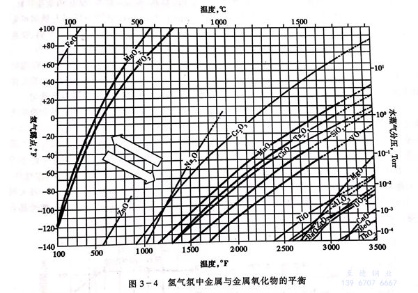 干燥的氫氣或分解氨常用做爐中釬焊不銹鋼時的還原性保護氣氛,它們可還原不銹(xiu)鋼表面的氧化膜,并保護不銹鋼表面在釬焊時不再氧化。一般要求氫氣或分解氨的露點低于-40℃,但也要考慮保護氣體的露點要與釬焊溫度及母材的成分相適應。釬焊溫度越低、不銹鋼表面氧化膜越穩定,要求氫氣露點越低,見圖3-4。使用分解氨作保護氣氛時,必須保證NH3完全分解,避免殘余的NH3使不銹鋼表面氮化。