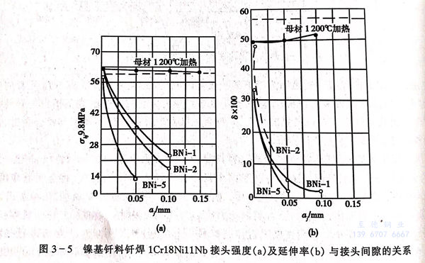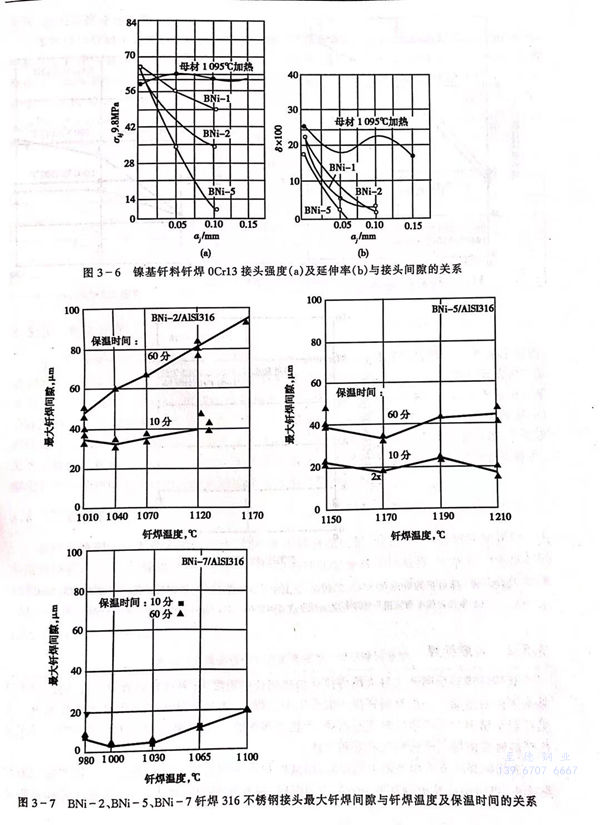 在釬焊(han)(han)實(shi)際部件(jian)時,有時部件(jian)加(jia)工精(jing)度或(huo)裝配精(jing)度很難保(bao)(bao)證(zheng)釬縫(feng)間(jian)隙很小,適當(dang)地提(ti)高釬焊(han)(han)溫(wen)度或(huo)延(yan)長(chang)保(bao)(bao)溫(wen)時間(jian)可增(zeng)大最大釬焊(han)(han)間(jian)隙,見圖(tu)3-7。當(dang)在高溫(wen)下長(chang)時間(jian)保(bao)(bao)溫(wen)造成母(mu)材晶粒(li)過分長(chang)大或(huo)釬料對(dui)母(mu)材溶蝕(shi)過度時,也可在焊(han)(han)后接頭冷卻到(dao)某一較低(di)溫(wen)度保(bao)(bao)溫(wen),通過擴散(san)消(xiao)除(chu)釬縫(feng)中的脆性相而(er)增(zeng)大最大釬焊(han)(han)間(jian)隙,見圖(tu)3-8。但由于磷原子較大,向母(mu)材中擴散(san)困(kun)難,這些措施對(dui)Ni-Cr-P和Ni-P這類釬料作用不大。