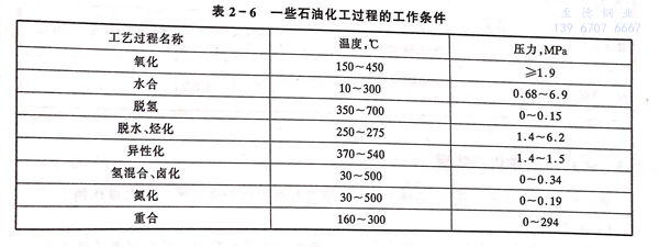 其他加工過程包括氧化、水合、脫氫、脫水、烴化、異性化等。將要接觸工藝過程相關的酸性介質,所使用的材料主要是316不(bu)銹鋼(gang) 和316L不銹鋼、Inconel 600、Incoloy 800,20號合金以及Hastelloy B、C、D等。這些工藝過程的工作條件見表2-6。在石油化工的工藝過程中某些工藝環節需使用硫酸、氫氟酸、磷酸、鹽酸等強腐蝕性介質,根據酸的濃度,溫度的不同而使用不同的耐蝕材料。