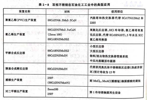 雙相不銹鋼在石油化工中已獲得成功應用,見表2-8。