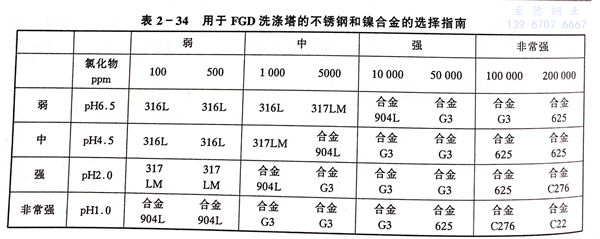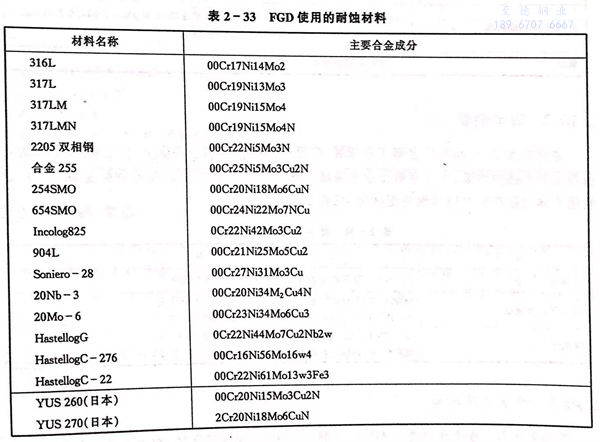 在煙氣脫硫裝置中所使用的耐蝕材料涉及到一般不銹鋼、高性能不銹鋼以及鎳基耐蝕合(he)金,見表2-33.可根據介質條件進行合理選擇。通常按表2-34所列原則選擇煙氣脫硫不同裝置的耐蝕材料。