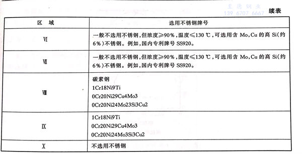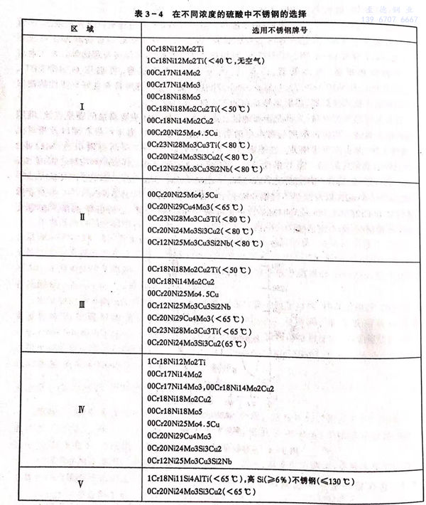 硫酸對不銹鋼的腐蝕,與酸的濃度和溫度有關。通常,在純硫酸中不選擇不含Mo的Cr-Ni奧氏體不銹鋼作為結構材料。根據硫酸的腐蝕性和不銹鋼的耐蝕性,可按圖3-4劃分的區域進行合理選用。通常,316不銹鋼是在硫酸介質中可應用的最低牌號,一些鉬、銅復合的高性能不銹鋼僅能用于80℃以下的各種濃度的硫酸中,在高于80℃,90%以下的硫酸中,只能選用鎳基或鐵鎳基耐蝕(shi)合金。在高溫高濃硫酸(90%~98%)中,高硅約6%)并含鉬、銅(tong)的不銹鋼具有優良的耐蝕性。在圖3-4中各區域可選用的不銹鋼牌號見表3-4。