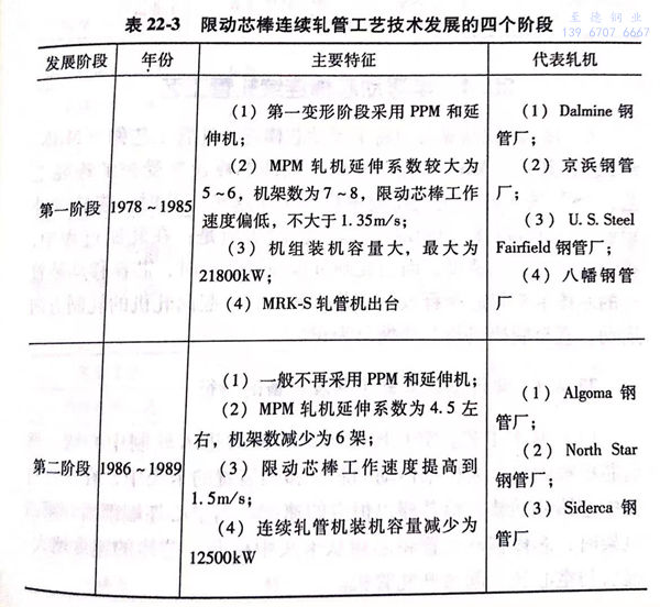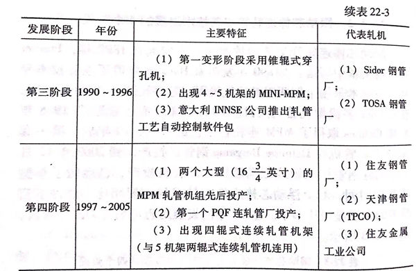 不(bu)銹鋼(gang)(gang)管(guan)限(xian)動(dong)芯棒(bang)連軋(ya)管(guan)工藝(yi)的(de)(de)技(ji)術(shu)發(fa)(fa)展(zhan)(zhan)(zhan)史應溯自1890年,Pfeiffer在一(yi)篇文章中寫道:“1890年發(fa)(fa)明家Heckert 申(shen)請了連軋(ya)技(ji)術(shu)專利(li),該技(ji)術(shu)采用十架兩(liang)輥高速(su)軋(ya)機(ji)固(gu)定芯棒(bang)軋(ya)制空心管(guan)坯(pi)。可(ke)見(jian)在Calmes 多(duo)(duo)機(ji)架軋(ya)管(guan)機(ji)問世前(qian)80年,就已有了雛形。”1968年A.H.Calmes 取(qu)得了MPM連軋(ya)管(guan)工藝(yi)的(de)(de)權利(li),10年后,第一(yi)套MPM連軋(ya)管(guan)機(ji)在Dalmine Bergamo 鋼(gang)(gang)管(guan)廠投產,到2003年12月天津無縫不(bu)銹鋼(gang)(gang)管(guan)廠三輥式限(xian)動(dong)芯棒(bang)連軋(ya)管(guan)機(ji)投產,已經歷(li)了整(zheng)整(zheng)25年的(de)(de)時間,和全浮動(dong)芯棒(bang)連軋(ya)管(guan)技(ji)術(shu)的(de)(de)發(fa)(fa)展(zhan)(zhan)(zhan)相比,這(zhe)種工藝(yi)技(ji)術(shu)的(de)(de)發(fa)(fa)展(zhan)(zhan)(zhan)顯(xian)得快多(duo)(duo)了。這(zhe)25年的(de)(de)發(fa)(fa)展(zhan)(zhan)(zhan)歷(li)程可(ke)劃分為四(si)個階段,如表22-3所示。