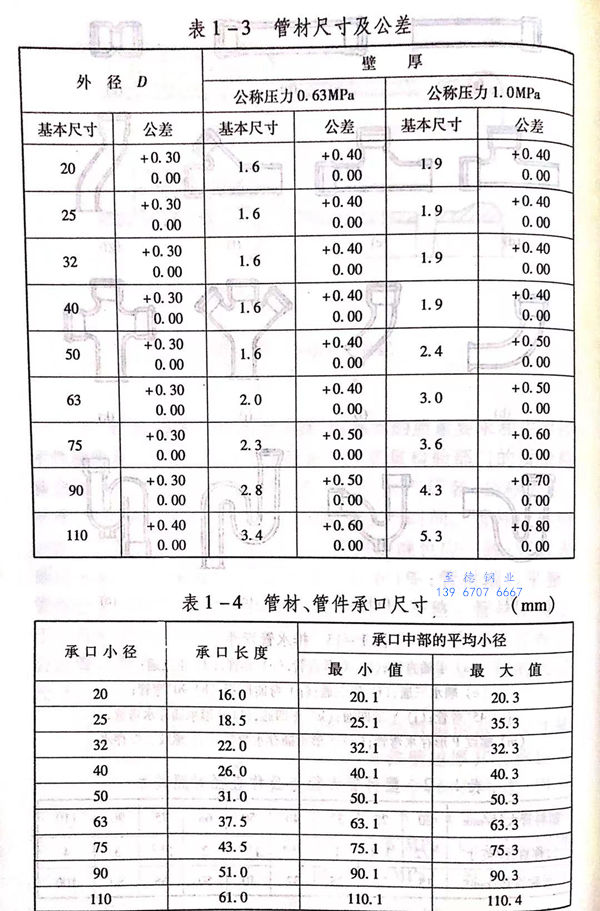 給(gei)水硬聚氯乙烯管(guan)(guan)道的(de)基本(ben)尺寸是(shi)以大(da)徑來(lai)表(biao)(biao)示的(de)(見表(biao)(biao)1-2).管(guan)(guan)材(cai)(cai)、管(guan)(guan)件(jian)(jian)壁越厚其公(gong)(gong)稱壓(ya)力(li)越高。管(guan)(guan)材(cai)(cai)現行國(guo)家產品(pin)等級較多,從(cong)安(an)全(quan)、耐久考慮,用于建筑物內的(de)管(guan)(guan)材(cai)(cai)、管(guan)(guan)件(jian)(jian)公(gong)(gong)稱壓(ya)力(li)應(ying)采用1.6 MPa等級(大(da)徑≤25mm,小口徑的(de)管(guan)(guan)道公(gong)(gong)稱壓(ya)力(li)均(jun)采用1.6 MPa;大(da)口徑的(de)管(guan)(guan)道可適當降低(di)公(gong)(gong)稱壓(ya)力(li)等級,但必須≥1.0 MPa)。表(biao)(biao)1-3為管(guan)(guan)材(cai)(cai)尺寸及公(gong)(gong)差,表(biao)(biao)1-4為管(guan)(guan)材(cai)(cai)、管(guan)(guan)件(jian)(jian)承口尺寸。