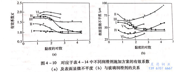 在(zai)潤滑墊的(de)(de)(de)(de)(de)玻(bo)(bo)(bo)(bo)(bo)璃(li)黏(nian)度(du)(du)不(bu)(bu)變(bian)(η=100Pa·s)時,滾(gun)(gun)涂(tu)玻(bo)(bo)(bo)(bo)(bo)璃(li)的(de)(de)(de)(de)(de)黏(nian)度(du)(du)變(bian)化(hua)(hua)(方案IV)比方案II在(zai)更(geng)大(da)程(cheng)度(du)(du)上影(ying)響到(dao)(dao)有效(xiao)系數(shu)(shu)。隨(sui)著玻(bo)(bo)(bo)(bo)(bo)璃(li)黏(nian)度(du)(du)增(zeng)加到(dao)(dao)50Pa·s時,潤滑劑有效(xiao)系數(shu)(shu)仍保持本身的(de)(de)(de)(de)(de)數(shu)(shu)值(zhi)(zhi),為K=1.8;而隨(sui)后開(kai)始急劇地下降,且(qie)(qie)在(zai)黏(nian)度(du)(du)達到(dao)(dao)6000Pa·s時,K值(zhi)(zhi)變(bian)為小(xiao)于1.總(zong)之(zhi),方案IV中(zhong)的(de)(de)(de)(de)(de)曲線K=f(7)和方案II中(zhong)的(de)(de)(de)(de)(de)曲線形狀是(shi)相同的(de)(de)(de)(de)(de),而且(qie)(qie)在(zai)此兩種(zhong)情況下,K值(zhi)(zhi)變(bian)化(hua)(hua)的(de)(de)(de)(de)(de)這一特點的(de)(de)(de)(de)(de)原因是(shi)相同的(de)(de)(de)(de)(de)。因此,滾(gun)(gun)涂(tu)玻(bo)(bo)(bo)(bo)(bo)璃(li)的(de)(de)(de)(de)(de)黏(nian)度(du)(du)變(bian)化(hua)(hua)比起玻(bo)(bo)(bo)(bo)(bo)璃(li)墊的(de)(de)(de)(de)(de)黏(nian)度(du)(du)變(bian)化(hua)(hua),在(zai)更(geng)大(da)程(cheng)度(du)(du)上明顯影(ying)響到(dao)(dao)擠壓力的(de)(de)(de)(de)(de)數(shu)(shu)值(zhi)(zhi)。表(biao)面顯微(wei)不(bu)(bu)平度(du)(du)的(de)(de)(de)(de)(de)最(zui)小(xiao)值(zhi)(zhi),發生在(zai)滾(gun)(gun)涂(tu)玻(bo)(bo)(bo)(bo)(bo)璃(li)粉黏(nian)度(du)(du)為10~50Pa·s內。當玻(bo)(bo)(bo)(bo)(bo)璃(li)黏(nian)度(du)(du)更(geng)大(da)時,表(biao)面質量惡化(hua)(hua)。
