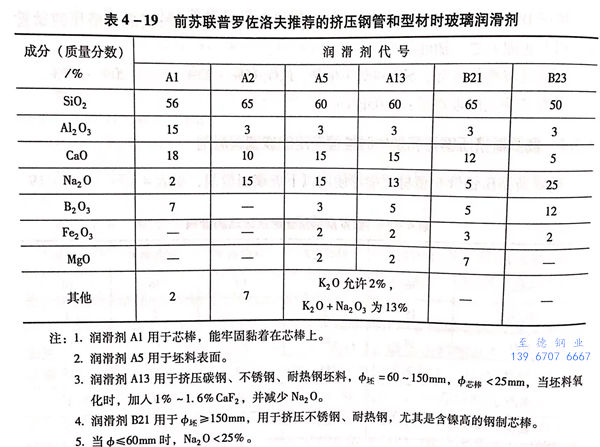 俄羅斯擠壓不銹鋼管和型材時推薦使用以下玻璃潤滑劑,見表4-17~表4-19.