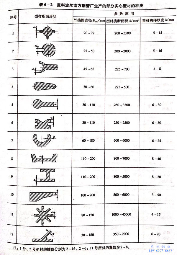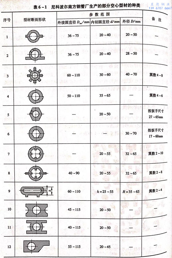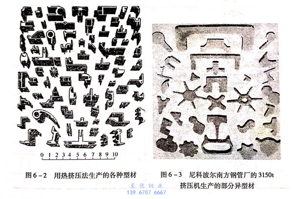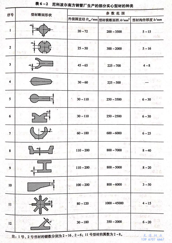 用熱擠壓法生產的各種型材如圖6-2所示。尼科波爾南方不(bu)銹鋼管廠的3150噸擠壓機生產的部分異型材如圖6-3所示。尼科波爾南方不銹鋼管廠生產的部分空心型材和實心型材的種類分別見表6-1和表6-2。