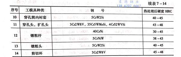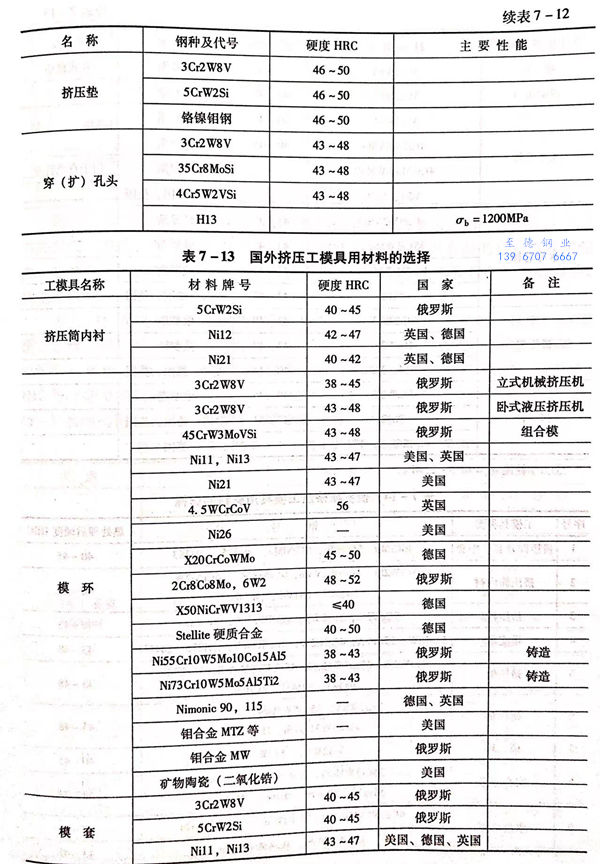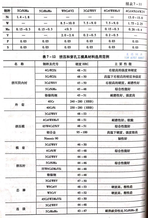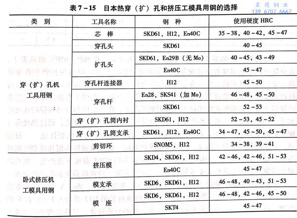 表7-15所(suo)列為日本在(zai)鋼(gang)熱(re)擠(ji)壓(ya)(ya)時所(suo)選(xuan)用(yong)的(de)(de)工(gong)模具鋼(gang)及(ji)其性能。其中(zhong),擠(ji)壓(ya)(ya)模、芯棒、擠(ji)壓(ya)(ya)墊、擠(ji)壓(ya)(ya)筒(tong)和穿(擴)孔(kong)筒(tong)內襯套(tao)等模具直(zhi)接與高(gao)溫(wen)(1000~1250℃)坯料接觸,并承受高(gao)的(de)(de)穿孔(kong)和擠(ji)壓(ya)(ya)壓(ya)(ya)力(li),一般采用(yong)SKD6、SKD61、H12等含硅量(liang)較高(gao)的(de)(de)Cr-Mo-V系列的(de)(de)工(gong)具鋼(gang),而(er)不(bu)采用(yong)SKD4、SKD5等W-Cr-V系列的(de)(de)鋼(gang)。表7-16所(suo)列為部(bu)分鋼(gang)號的(de)(de)化學成分。