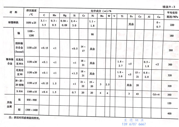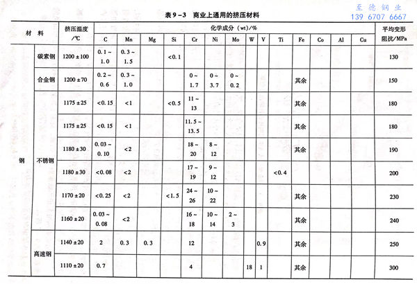 普通碳素鋼和低合金鋼的變形阻抗較小,在目前的鋼管生產總量中占有很大的比重,在大量生產時,選用軋管機最為有利,只是在生產不能軋制的斷面以及小批量生產的情況下,選擇擠壓法才比較經濟合理。而,在一些特殊的產品領域內,如高合金鋼、鐵素體高鉻鋼、奧氏(shi)體不銹鋼和各種耐蝕鋼、耐(nai)熱鋼以及高速工具鋼等材料的生產中,由于變形原理和經濟性的原因,擠壓法幾乎完全排擠了軋管法,成為首選。除此之外,在軋鋼機上不能生產或難以生產的尼莫尼克合金,哈斯特洛伊鎳合金,因科鎳爾合金,克倫奈爾鎳合金,蒙奈爾合金,因科洛依合金,齊爾康鋯合金和鎳、鈦、鉬等材料也可以采用擠壓法生產管材和型材。商業上通用的擠壓材料見表9-3。