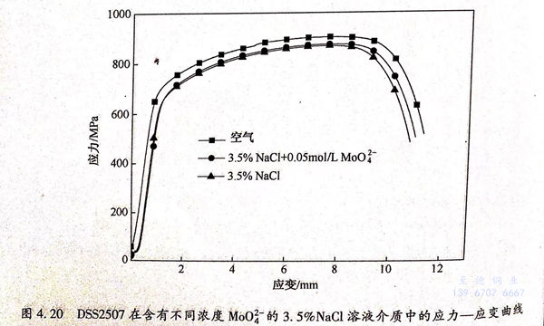 鉬酸根離子對不銹鋼的點蝕抑制作用一直被研究,G.O.Ilevbare指出鉬酸根離子可以通過控制亞穩態的點(dian)蝕和穩定點蝕來提高耐蝕性能。S.A.M.Refaey 發現無機鉬酸鹽通過增加點蝕電位來阻止酸性和氯化物溶液中的點蝕發生。因此,鉬酸根離子相當于一種抑制劑,一定含量的抑制劑可以減緩腐蝕的發生,而鉬酸根與雙相不銹鋼應力腐蝕敏感性關系的研究目前報道很少,本節采用慢應變拉伸的方法,分別討論鉬酸根離子對2205和2507兩種牌號雙相不銹鋼的應力腐蝕(shi)敏感性影響。