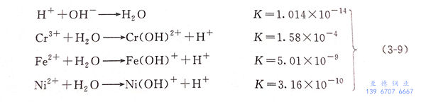 同時,還要考慮溶液中離子的水解,對于奧氏體不銹鋼,電化學反應產生的主要離子包括氫離子、鐵離子、鉻離子、鎳離子這些離子水解反應式和平衡常數為: