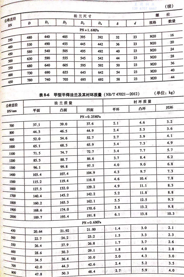 5. 甲型平焊法蘭與襯(chen)環質量見表(biao)8-6。