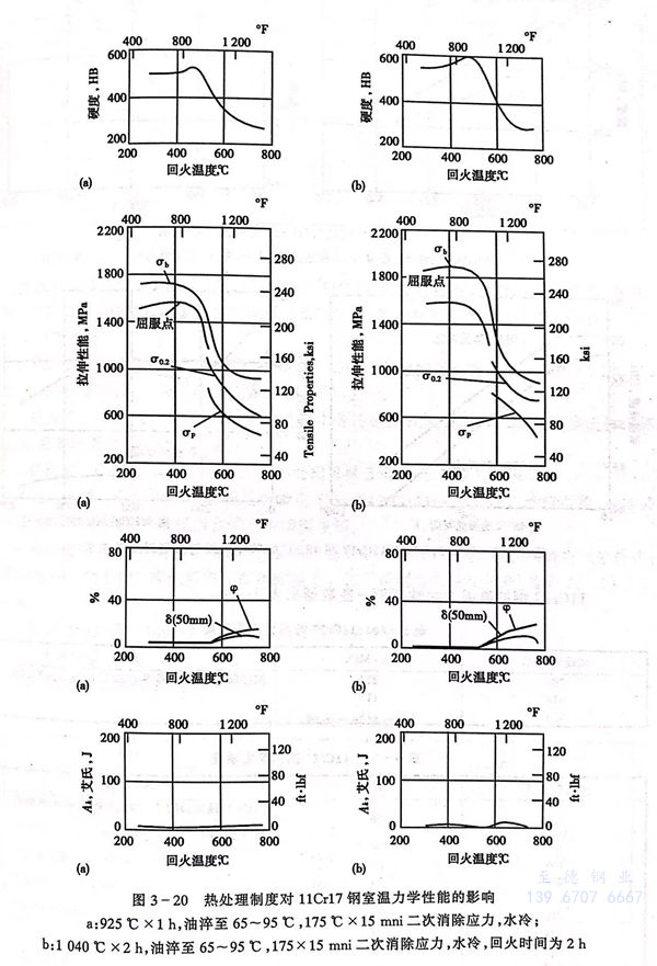7Cr17、68Cr17、440A不(bu)銹鋼、8Cr17、85Cr17、440B不(bu)銹鋼、11Cr17、108Cr17、440C不(bu)銹鋼的高(gao)溫力(li)學性能見圖3-21。在482℃回火,保(bao)溫時(shi)間和(he)軟化效果(guo)見圖3-22。