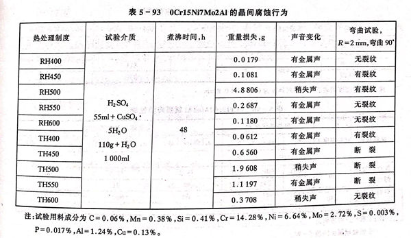 07Cr15Ni7Mo2Al、PH15-7Mo 不(bu)銹鋼(gang)的耐均(jun)勻腐(fu)蝕(shi)性能見表5-92,耐晶間(jian)腐(fu)蝕(shi)性能見表5-93。鋼(gang)的耐晶間(jian)腐(fu)蝕(shi)性能與熱處(chu)理(li)條件相(xiang)關:RH處(chu)理(li)制(zhi)度(du)500℃時(shi)效強度(du)最高,此時(shi)鋼(gang)不(bu)耐晶間(jian)腐(fu)蝕(shi);400~450℃或550~600℃時(shi)效鋼(gang)的強度(du)稍(shao)低,但耐晶間(jian)腐(fu)蝕(shi)。TH處(chu)理(li)制(zhi)度(du),不(bu)論是何種時(shi)效溫度(du)(400~600℃)均(jun)出現晶間(jian)腐(fu)蝕(shi)。