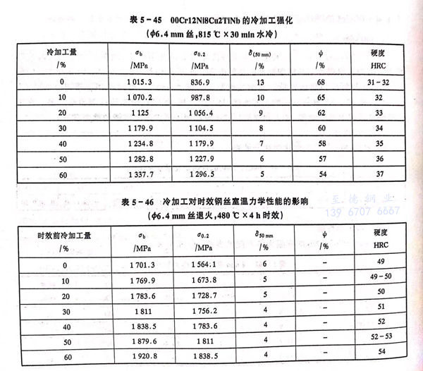 盡管此鋼在退(tui)火(huo)狀態下是馬氏體組織,但鋼的硬(ying)度僅為30~35HRC,易(yi)于進行(xing)冷(leng)加工,鋼的冷(leng)加工硬(ying)化(hua)傾向很低(見表5-45),不(bu)需中間退(tui)火(huo)即可進行(xing)較大變形量的冷(leng)加工,最終熱(re)處理(li)前進行(xing)冷(leng)變形,可獲得較高的拉伸(shen)強度和(he)屈服強度。