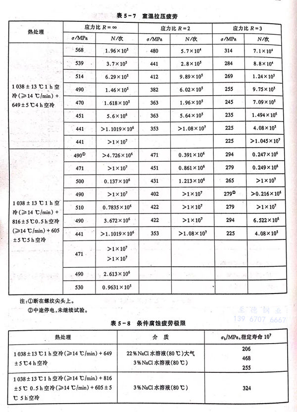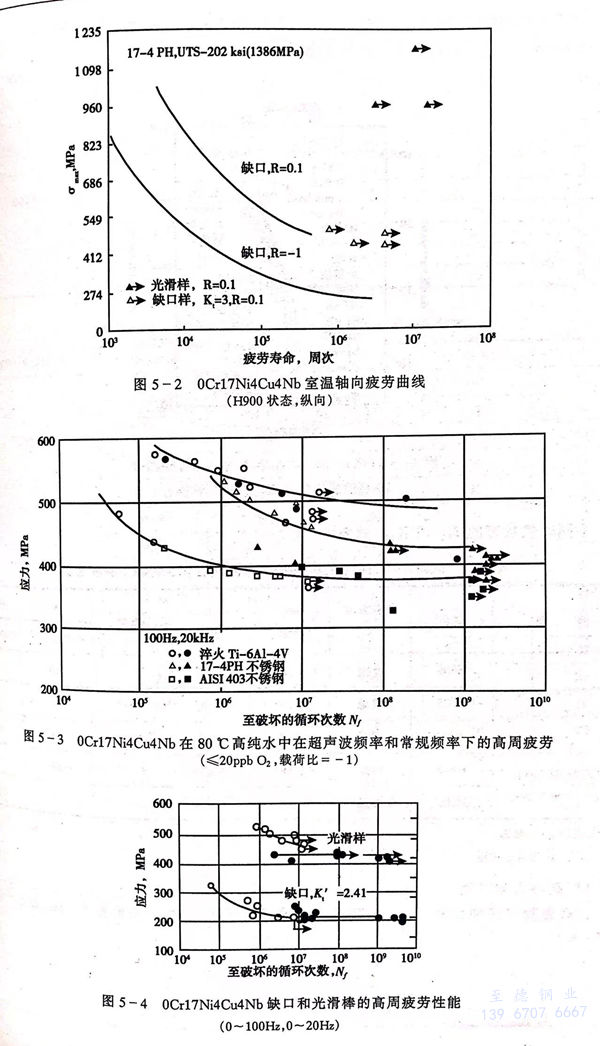 0Cr17Ni4Cu4Nb、05Cr17Ni4Cu4Nb、17-4PH 不(bu)銹鋼(gang)的(de)疲勞性能見表5-6至表5-8,在(zai)不(bu)同(tong)介(jie)質和試(shi)驗條件(jian)下的(de)疲勞行為見圖5-2至圖5-4。