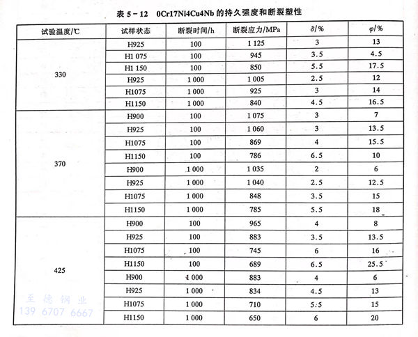 0Cr17Ni4Cu4Nb、05Cr17Ni4Cu4Nb、17-4PH 不銹(xiu)鋼(gang)的高溫長時(shi)力學性能見表5-12、表5-13和圖(tu)5-7。