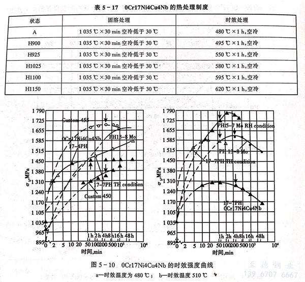 在(zai)固溶(rong)后(hou)鋼獲得(de)A狀(zhuang)態(tai)(馬氏體)后(hou),隨(sui)后(hou)可(ke)進(jin)行時效(xiao)處理,亦可(ke)以(yi)在(zai)固溶(rong)后(hou)采(cai)(cai)用過時效(xiao)處理后(hou)再重復固溶(rong),而(er)后(hou)熱處理的方式。(0Cr17Ni4Cu4Nb)17-4PH不銹鋼可(ke)采(cai)(cai)用不同的時效(xiao)處理調(diao)整(zheng)其強度水(shui)平,見圖5-10。
