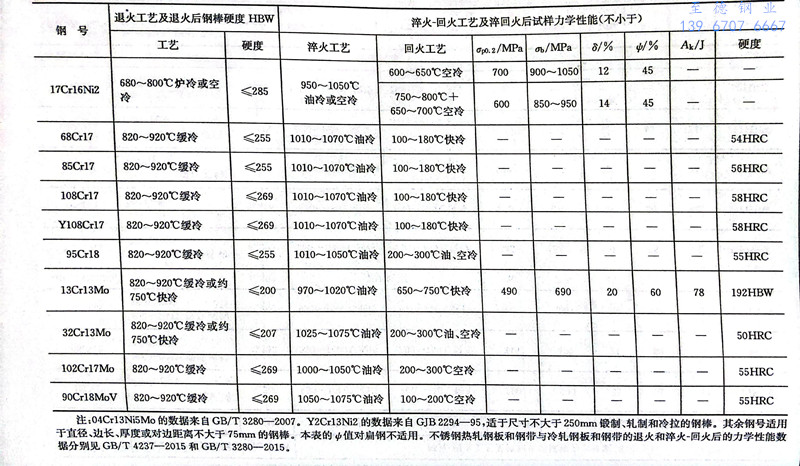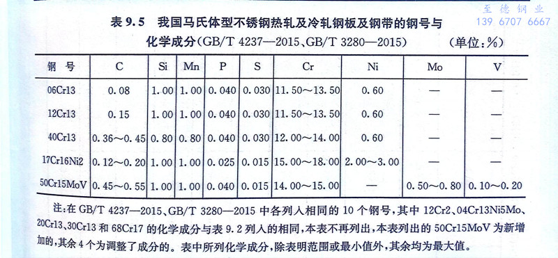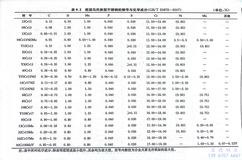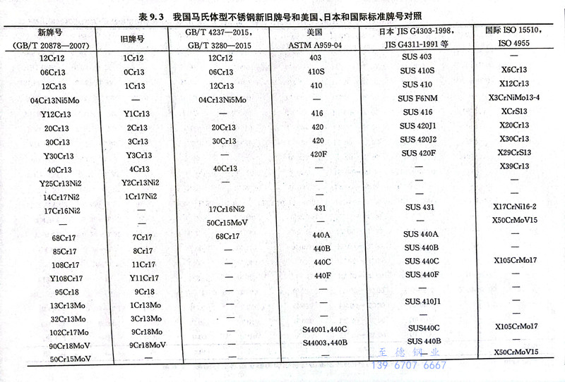 馬氏體不銹鋼在正常淬火溫度下是純奧氏體組織,淬火后的基體組織為馬氏體。如果鋼中含有較高的碳,在奧氏體化時仍保留部分未溶碳化物,淬火后的組織為馬氏體十碳化物及少量殘余奧氏體。表9.2為GB/T 20878-2007中列入的21個馬(ma)氏體不銹鋼的鋼號與化學成分。表9.3為我國馬氏體不銹鋼新舊牌號和相應美國、日本和國際標準牌號的對照。表9.4為我國馬氏體型不銹鋼鋼棒和試樣熱處理后的力學性能。表9.5為馬氏體型不銹鋼熱軋鋼板和鋼帶及冷軋(ya)鋼板(ban)和鋼帶的化學成分。