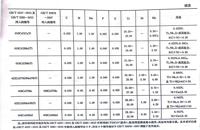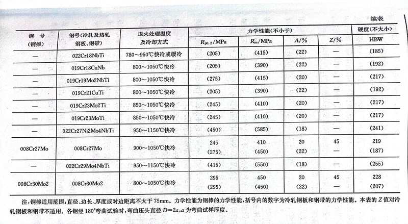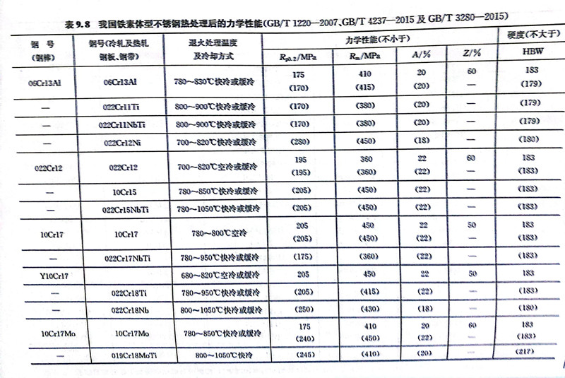 GB/T 20878-2007列入(ru)(ru)了15個鐵(tie)(tie)素(su)體(ti)(ti)型(xing)(xing)(xing)不(bu)銹(xiu)鋼(gang)(gang)的(de)(de)鋼(gang)(gang)號(hao)。由(you)于近年國內外加(jia)速(su)了現代(dai)鐵(tie)(tie)素(su)體(ti)(ti)型(xing)(xing)(xing)不(bu)銹(xiu)鋼(gang)(gang)的(de)(de)研究和(he)發展,在(zai)新修訂的(de)(de)GB/T 4237-2015及(ji)GB/T3280-2015中(zhong)列入(ru)(ru)的(de)(de)鐵(tie)(tie)素(su)體(ti)(ti)型(xing)(xing)(xing)不(bu)銹(xiu)鋼(gang)(gang)的(de)(de)鋼(gang)(gang)號(hao)有(you)23個,有(you)9個是新加(jia)入(ru)(ru)的(de)(de),去掉了GB/T 20878-2007中(zhong)的(de)(de)Y10Cr17。表(biao)(biao)9.6為(wei)GB/T 20878-2007、GB/T 4237-2015及(ji)GB/T 3280-2015中(zhong)列入(ru)(ru)的(de)(de)鐵(tie)(tie)素(su)體(ti)(ti)型(xing)(xing)(xing)不(bu)銹(xiu)鋼(gang)(gang)的(de)(de)鋼(gang)(gang)號(hao)及(ji)其化學(xue)成分(fen)。表(biao)(biao)9.7為(wei)我國鐵(tie)(tie)素(su)體(ti)(ti)型(xing)(xing)(xing)不(bu)銹(xiu)鋼(gang)(gang)新舊牌號(hao)和(he)相應美國、日本和(he)國際標準(zhun)牌號(hao)的(de)(de)對照。表(biao)(biao)9.8為(wei)我國鐵(tie)(tie)素(su)體(ti)(ti)型(xing)(xing)(xing)不(bu)銹(xiu)鋼(gang)(gang)熱處理(li)后的(de)(de)力學(xue)性能。