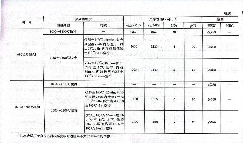表9.16為GB/T 20878-2007列入的10個沉(chen)淀硬化不銹鋼(gang)的鋼號與化學成分。表9.17為我國沉淀硬化型不銹鋼新舊牌號和相應美國、日本和國際標準牌號的對照。表9.18為沉淀硬化型不銹鋼棒的熱處理與力學性能(GB/T 1220-2007)。表9.19和表9.20分別為沉淀硬化型不銹鋼冷軋鋼板和鋼帶固溶處理后和沉淀硬化處理后的力學性能(GB/T 3280-2015)。