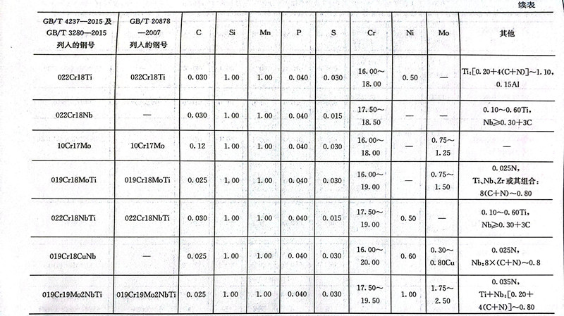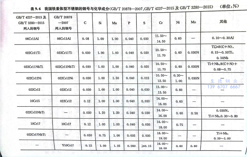 超(chao)級(ji)鐵(tie)素(su)(su)(su)體不(bu)銹鋼按碳、氮含量的不(bu)同,可(ke)區分為高(gao)(gao)純(chun)和一般(ban)純(chun)度兩(liang)類(lei)。前者碳:≤0.01%、氮:≤0.015%、碳+氮:≤0.01%;后者采(cai)用加(jia)入Ti、Nb穩(wen)定化(hua)措(cuo)施以防止敏化(hua)后耐蝕性(xing)(xing)降低。高(gao)(gao)純(chun)超(chao)級(ji)鐵(tie)素(su)(su)(su)體不(bu)銹鋼性(xing)(xing)能(neng)好,但生產成本偏高(gao)(gao),除在特(te)殊情況下一般(ban)不(bu)被采(cai)用;一般(ban)純(chun)度并加(jia)人穩(wen)定化(hua)元素(su)(su)(su)一類(lei),可(ke)采(cai)用通(tong)用不(bu)銹鋼裝(zhuang)備進(jin)行生產,其(qi)性(xing)(xing)能(neng)亦(yi)可(ke)達到高(gao)(gao)純(chun)度類(lei)的水平,因此采(cai)用較(jiao)多。GB/T 4237-2015和GB/T 3080-2015納入了4個超(chao)級(ji)鐵(tie)素(su)(su)(su)體不(bu)銹鋼(見表(biao)9.6)。