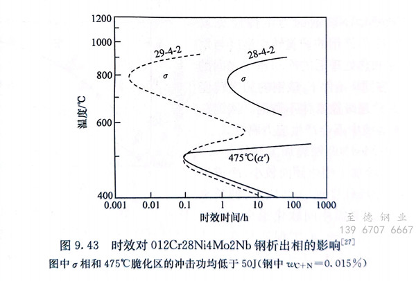 012Cr28Ni4Mo2Nb 鋼的特點是控制C+N含量(≤0.03%)并加入約4%的Ni以改善鋼的韌性,特別是降低鋼的韌脆轉變溫度;用Nb穩定化,既可以防止由于加入Ti形成TiN所導致的韌性下降,又可以借Nb具有更強的固定碳的能力降低鋼的晶間腐蝕的敏感性,同時Nb對鋼的韌脆轉變溫度的不利影響要比Ti為弱并可以細化晶粒。圖9.43顯示了012Cr28Ni4Mo2Nb(28-4-2)鋼由于在中溫區(約800℃)。相的析出和475℃脆(cui)性區a'相的析出對韌性的影響。圖中還顯示,由于Cr29Mo4Ni2(29-4-2)鋼的Cr、Mo含量高而Ni含量低,。相的析出傾向更為敏感。012Cr28Ni4Mo2Nb 鋼的力學性能見表9.33。