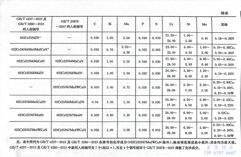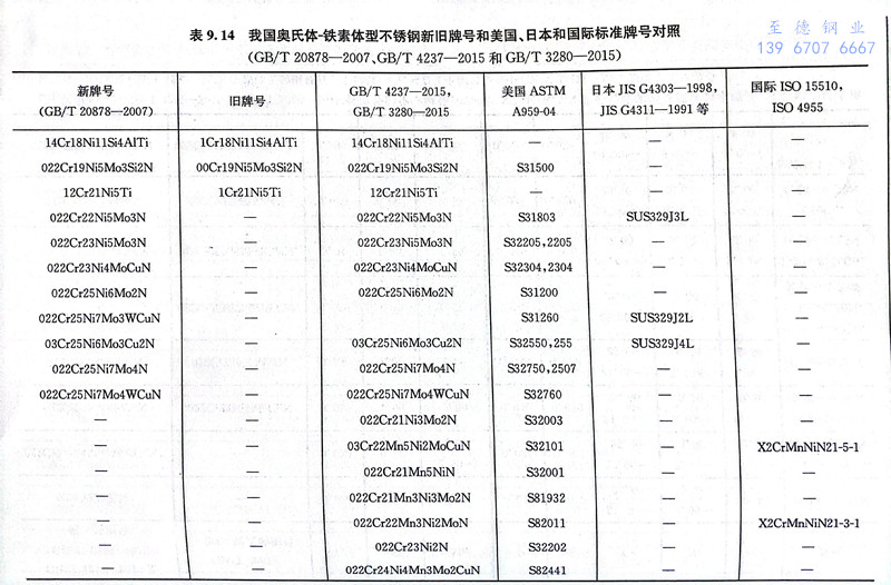 我國在(zai)20世紀70年代中期開(kai)始發展雙相(xiang)不(bu)(bu)銹鋼,在(zai)GB 1220-84和GB 1220-92中列入(ru)了3個(ge)鋼號。在(zai)制定GB/T 20878-2007時,吸收了國內外已(yi)開(kai)發出的一些性能良好的雙相(xiang)鋼不(bu)(bu)銹鋼,共列入(ru)了11個(ge)鋼號。2015年修訂的GB/T 4237-2015及(ji)GB/T 3280-2015中列入(ru)的奧氏體-鐵素體不(bu)(bu)銹鋼牌號有17個(ge),其中10個(ge)是已(yi)列入(ru)GB/T 20878-2007的牌號,新(xin)添加的有7個(ge),其化學(xue)成分及(ji)其固溶處(chu)理(li)后的力學(xue)性能分別見表9.13和表9.15。