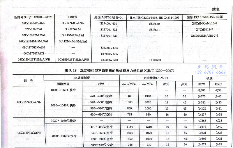 我國列入GB/T 20878-2007的馬氏體沉淀硬化不銹鋼的牌號有四個,分別是05Cr17Ni4Cu4Nb、05Cr15Ni5Cu4Nb,022Cr12Ni9Cu2NbTi、04Cr13Ni8Mo2Al,其化學成分、熱處理制度和力學性能分別見表9.16、表9.18、表9.19和表9.20。這四種鋼的化學成分基本上與表9.55中的17-4PH、15-5PH、Costom 455、PH13-8Mo鋼相當。