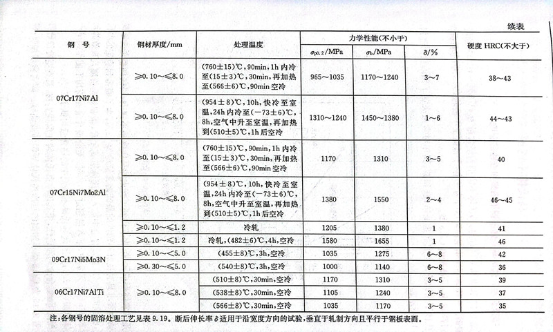 022Cr12Ni9Cu2NbTi、Custom 455 不(bu)銹鋼(gang)在溫(wen)(wen)度區(qu)間900~1260℃極易鍛造,適宜的鍛造加(jia)熱和(he)均(jun)熱溫(wen)(wen)度為(wei)1040~1150℃,終(zhong)鍛溫(wen)(wen)度應控制在815~925℃,可(ke)(ke)獲(huo)得(de)(de)較細的晶(jing)粒尺寸,鍛后(hou)(hou)(hou)空冷(leng)。鍛后(hou)(hou)(hou)應進(jin)(jin)行固溶處(chu)理(li),固溶溫(wen)(wen)度為(wei)816~843℃,隨后(hou)(hou)(hou)快冷(leng),若截(jie)面較小可(ke)(ke)以(yi)水淬,組織(zhi)為(wei)全馬氏體組織(zhi),硬度為(wei)30~35HRC。生產企(qi)業一般(ban)均(jun)以(yi)固溶狀態(tai)的產品供貨(huo),用戶加(jia)工后(hou)(hou)(hou)只需進(jin)(jin)行時(shi)效處(chu)理(li)以(yi)獲(huo)得(de)(de)最后(hou)(hou)(hou)的性能。時(shi)效溫(wen)(wen)度可(ke)(ke)在480~560℃選擇(ze),保溫(wen)(wen)4h,空冷(leng),時(shi)效后(hou)(hou)(hou)的尺寸變化僅為(wei)-0.001mm/mm。固溶和(he)時(shi)效處(chu)理(li)后(hou)(hou)(hou)鋼(gang)的力學性能見表(biao)9.19和(he)表(biao)9.20。