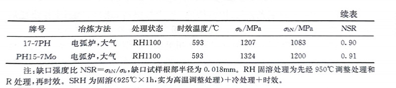 17-7PH和PH15-7Mo鋼具有高的強度并得到較廣泛的應用,但它們存在明顯的缺點,即在σb超過1380MPa時,鋼的缺口敏感性增加,經熱處理后在315~425℃長期使用時產生脆化傾向。表9.67為三種半奧氏體沉淀硬化不銹鋼的抗拉強度與缺口敏感性,這三種鋼經510℃時效后的抗拉強度相近,但其缺口敏感性卻大不相同,17-7PH和PH15-7Mo這兩種鋼的缺口敏感性遠高于PH14-8Mo鋼。當三種鋼處理成具有相同的缺口敏感性時,PH15-7Mo鋼可以利用的強度水平高于17-7PH鋼117MPa鋼,遠低于PH14-8Mo鋼。缺口敏感性這一指標可以直接反映這些鋼在海洋大氣環境條件下的抗應力腐蝕性。