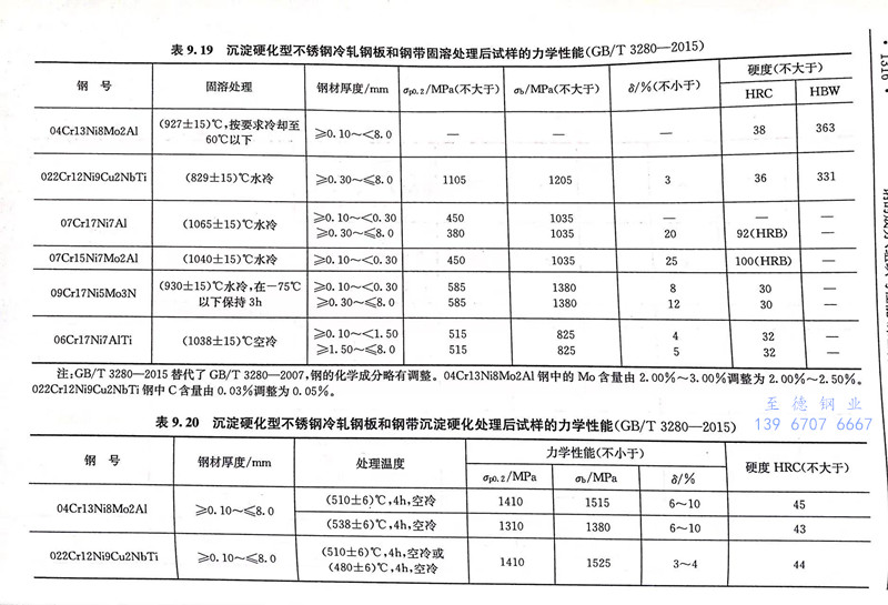 06Cr17Ni7AlTi 不銹鋼是在07Cr17Ni7Al 不銹鋼基礎上適當降低鋁含量并添加鈦而開發出的鋼種,加入鈦可以防止鋼的晶間腐蝕。該鋼的熱處理工藝和力學性能見表9.19和表9.20。
