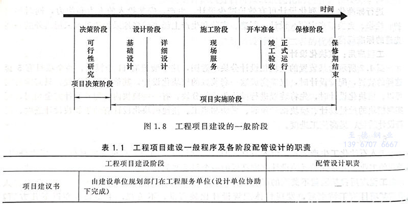 石油化工(gong)(gong)廠的(de)設(she)計是一個復(fu)雜的(de)系統工(gong)(gong)程(cheng)(cheng),從規劃到工(gong)(gong)程(cheng)(cheng)設(she)計、施(shi)工(gong)(gong)建(jian)設(she)、裝置的(de)運行改造等各階段都會(hui)傾(qing)注(zhu)項(xiang)目(mu)團隊(dui)的(de)心血,它是各專(zhuan)業團結(jie)(jie)協作、辛勤勞動(dong)的(de)結(jie)(jie)晶。工(gong)(gong)程(cheng)(cheng)項(xiang)目(mu)建(jian)設(she)的(de)一般階段如圖1.8所示(shi)。工(gong)(gong)程(cheng)(cheng)項(xiang)目(mu)建(jian)設(she)一般程(cheng)(cheng)序(xu)及各階段配管設(she)計的(de)職責(ze)見表1.1。