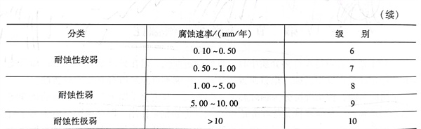 評(ping)定(ding)均(jun)勻腐(fu)蝕(shi)(shi)(shi)(shi)的(de)(de)方法是在試(shi)驗條件(jian)下,測出單位面積上經一定(ding)時間(jian)腐(fu)蝕(shi)(shi)(shi)(shi)以后所(suo)損失的(de)(de)重量(g/㎡·年(nian)),即為(wei)腐(fu)蝕(shi)(shi)(shi)(shi)速(su)率(lv),若(ruo)以被(bei)腐(fu)蝕(shi)(shi)(shi)(shi)的(de)(de)深度(mm/年(nian))計,則更便于計算設(she)備的(de)(de)耐蝕(shi)(shi)(shi)(shi)壽命。根據(ju)腐(fu)蝕(shi)(shi)(shi)(shi)速(su)率(lv)不同(tong),可將金屬材料(liao)的(de)(de)耐蝕(shi)(shi)(shi)(shi)性(xing)分(fen)為(wei)10級(ji),見(jian)表1-13。根據(ju)不同(tong)的(de)(de)使用情況對(dui)耐蝕(shi)(shi)(shi)(shi)性(xing)一般(ban)分(fen)為(wei)兩大等級(ji):腐(fu)蝕(shi)(shi)(shi)(shi)速(su)率(lv)小于0.01mm/年(nian)的(de)(de),認(ren)為(wei)是“完全耐蝕(shi)(shi)(shi)(shi)”;腐(fu)蝕(shi)(shi)(shi)(shi)速(su)率(lv)小于0.1mm/年(nian)的(de)(de),認(ren)為(wei)是“耐蝕(shi)(shi)(shi)(shi)”。這里顯然(ran)意味著,腐(fu)蝕(shi)(shi)(shi)(shi)速(su)率(lv)超過(guo)0.1mm/年(nian),屬于不耐蝕(shi)(shi)(shi)(shi)或(huo)不太耐蝕(shi)(shi)(shi)(shi)。此(ci)(ci)外,還(huan)有別的(de)(de)分(fen)級(ji)方法,在此(ci)(ci)僅(jin)舉此(ci)(ci)一種(zhong)。