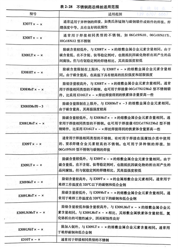 不銹鋼藥(yao)芯焊絲(si)的適(shi)用(yong)范(fan)圍見表 2-28