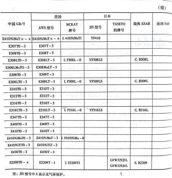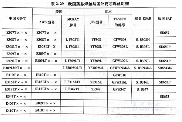 藥芯焊絲電弧焊(PCAW)有取代不銹鋼焊(han)條電弧焊的明顯趨勢,甚至還將逐步取代實芯焊絲氣體保護焊。不銹鋼藥芯(xin)焊絲型號在國內已發展到50余種。我國藥芯焊絲與國外藥芯焊絲對照,見表2-29。